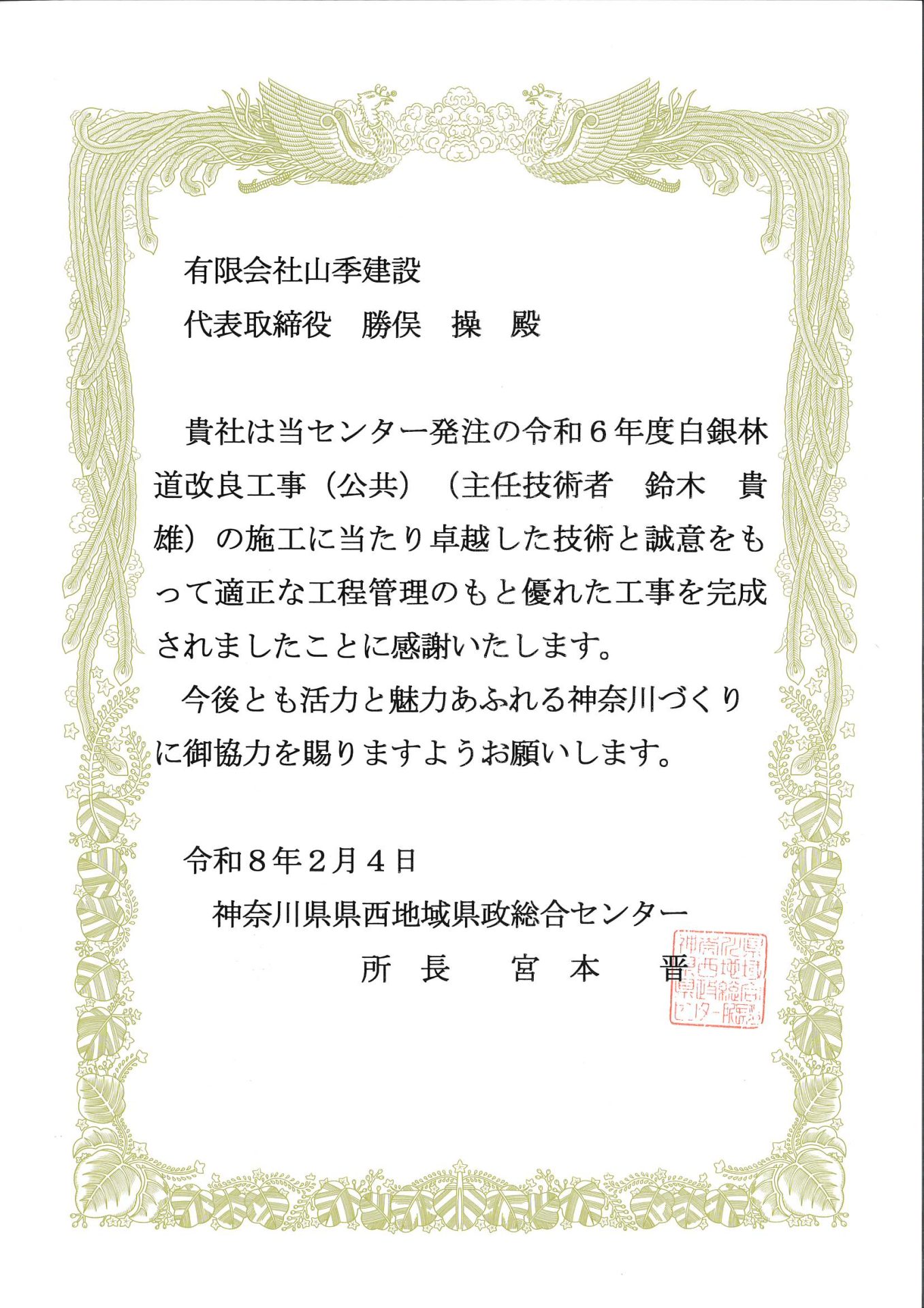 県政総合センターから感謝状をいただきました 2026.02.06 2026年2月4日、県西地域県政総合センター所長より「白銀林道改良工事」への感謝状を頂戴することが出来ました。このような形で評価された事に感謝します。